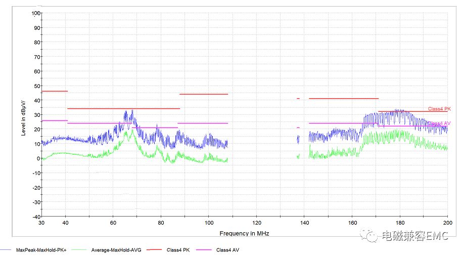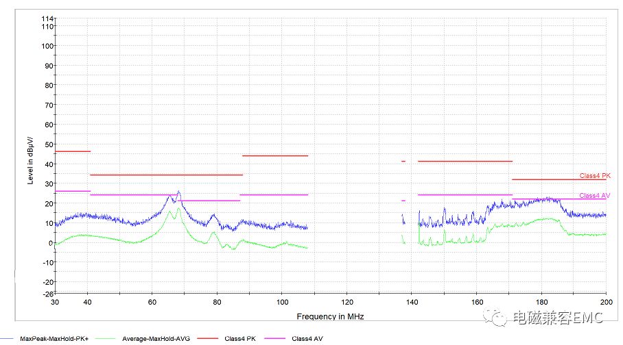 由E=1.3SIF^2/D可以看出,频率的影响最大,降低开关频率为400KHz后,叠加在包络上的周期性信号消失,超标点合格如下图。