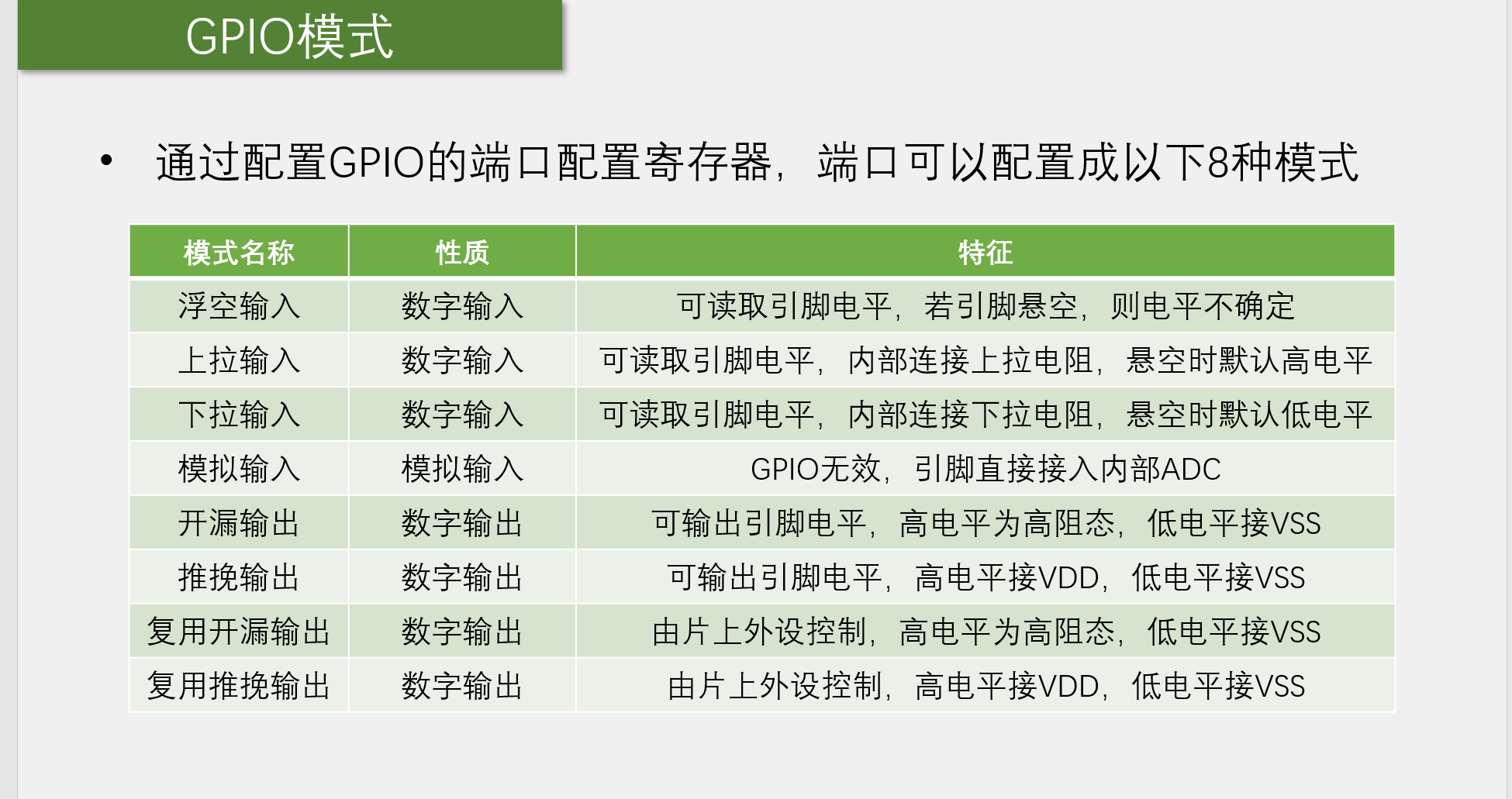•输出模式下可控制端口输出高低电平,用以驱动LED、控制蜂鸣器、模拟通信协议输出时序等