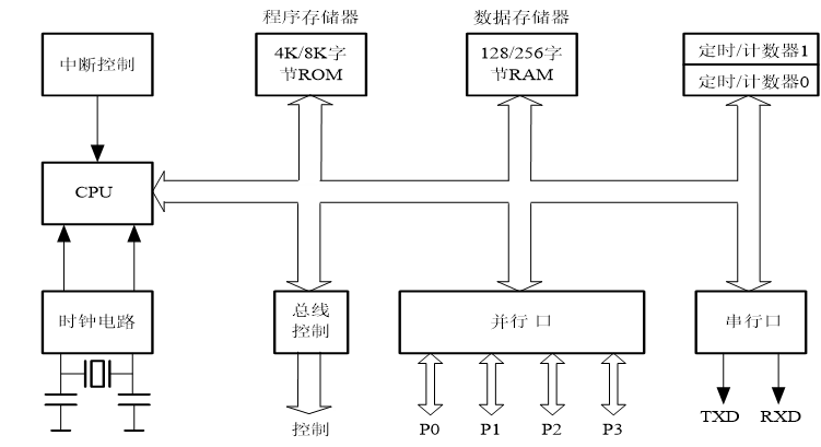 由图1可见,MCS-51系列单片机主要由以下部件通过片内总线连接而成:中央处理器(CPU)、数据存储器(RAM)、程序存储器(ROM)、并行输入/输出口(P0口~P3口)、串行口、定时器/计数器、中断控制、总线控制及时钟电路。