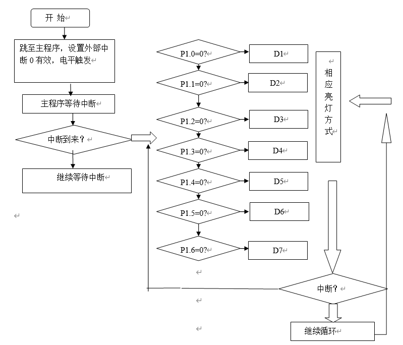 这是一种比较笨但又最易理解的方法,采用顺序程序结构,用位指令控制P1口的每一个位输出高低电平,从而来控制相应LED灯的亮灭。程序如下: