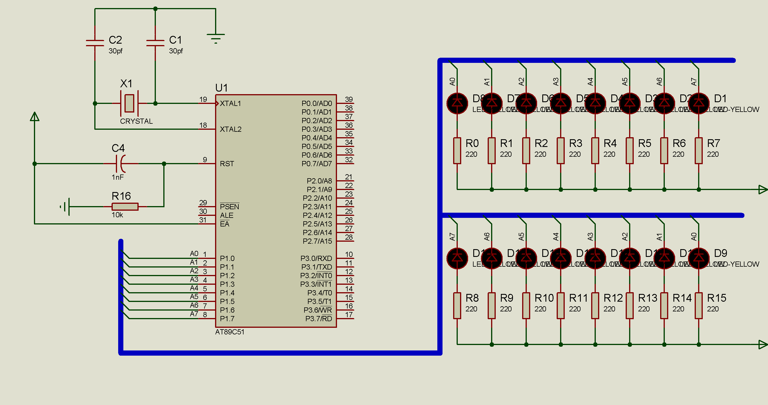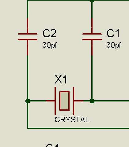 此次流水灯设计,我们用1MHZ晶振和30pf的电容,它们组成一个稳定的自己振荡器。电容的大小可以影响震荡频率的高低,振荡器的稳定性和起振的快速性。为单片机提供标准时钟。