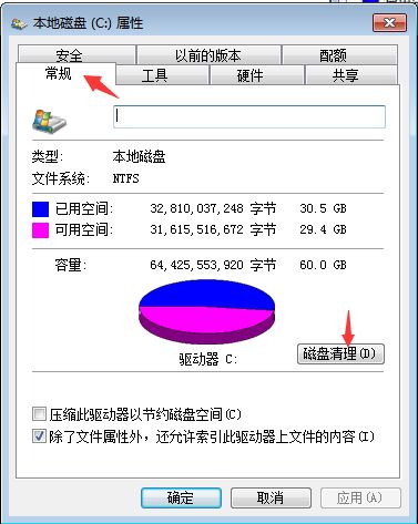 2、清理磁盘。打开C盘的属性,点击常规,点击清理缓存,清理完成后,C盘又有空间了。
