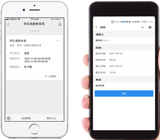 绑定学生家长联系电话,学生请假系统在线推送请假消息至家长端,实现家校互联;