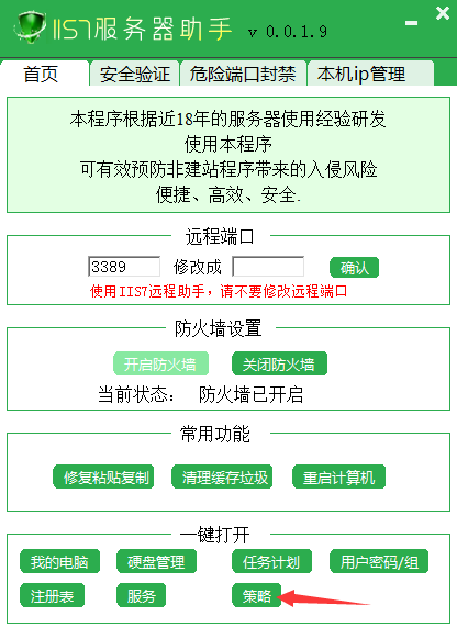 下载并安装服务器助手,在界面找到“策略”按钮并点击,组策略打开了。