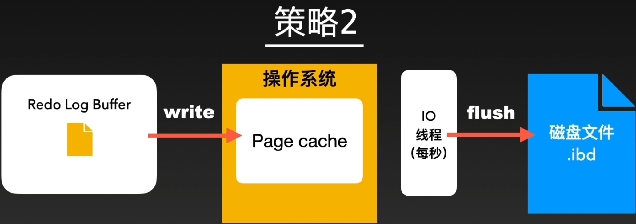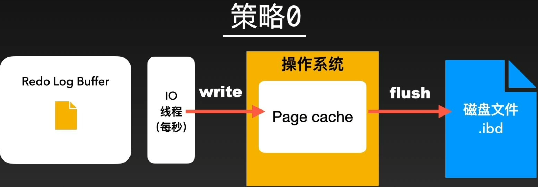 而0、2两个策略的一致性没有这么强,0策略只会写入到内存Redo Log Buffer中,每个一秒钟才会进行系统内存放入和刷盘操作。2策略会写入Redo Log Buffer和操作系统内存,但也会等待每秒的刷盘操作