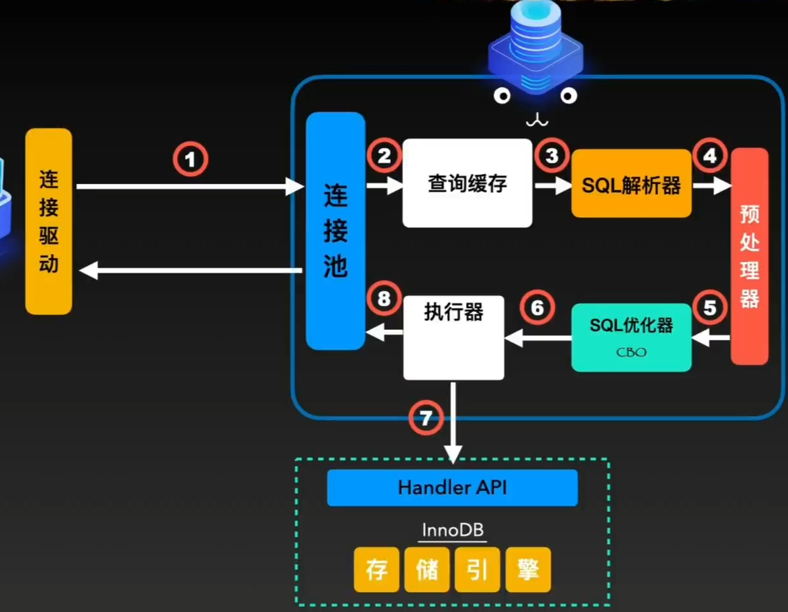 通过优化器之后,SQL就会变成一个可执行的”执行计划“,执行器就会再存储引擎中查找相关的Handler API,同时进行组合和调用