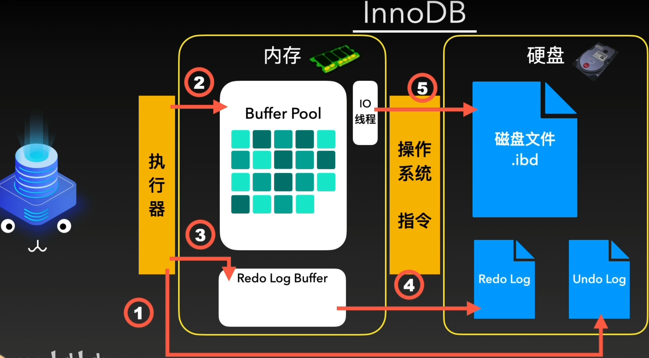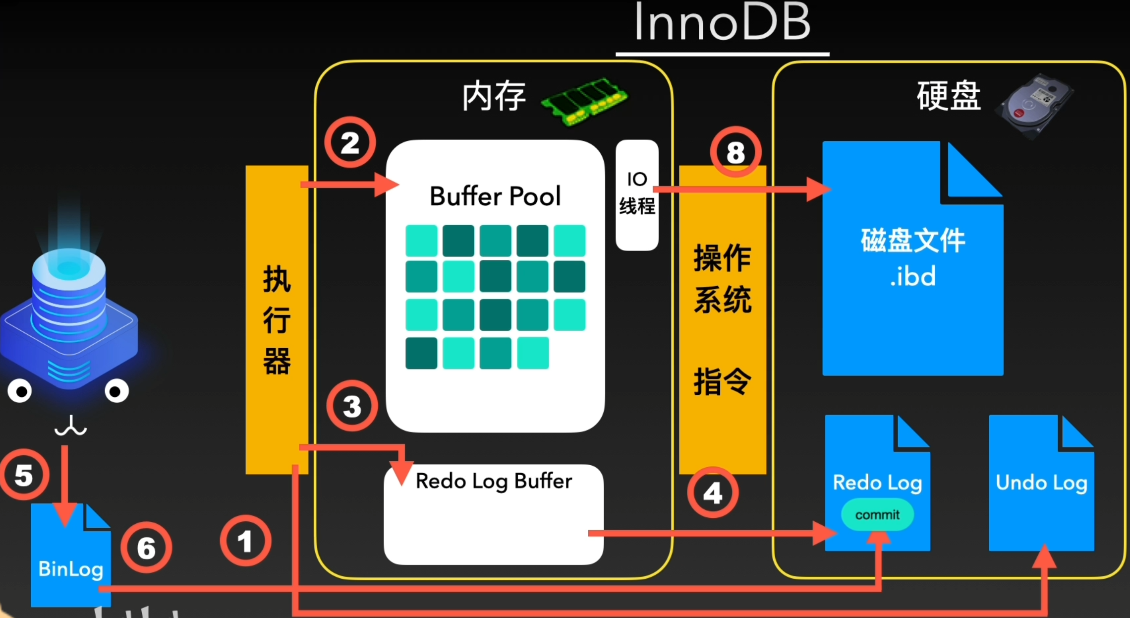 这套体系在数据进入Buffer Pool之后,就将更新写入信息放入内存的另一个区域Redo Log Buffer中,然而,光写入内存也无法解决刚才的问题,因此还要将其刷入磁盘中。