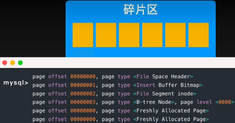 段的主要作用时用来区分不同功能区的“区”和在碎片区中的"页",分为非叶子节点段,叶子节点段。这两个段与冲说的B+索引中的叶子、非叶子节点相对应