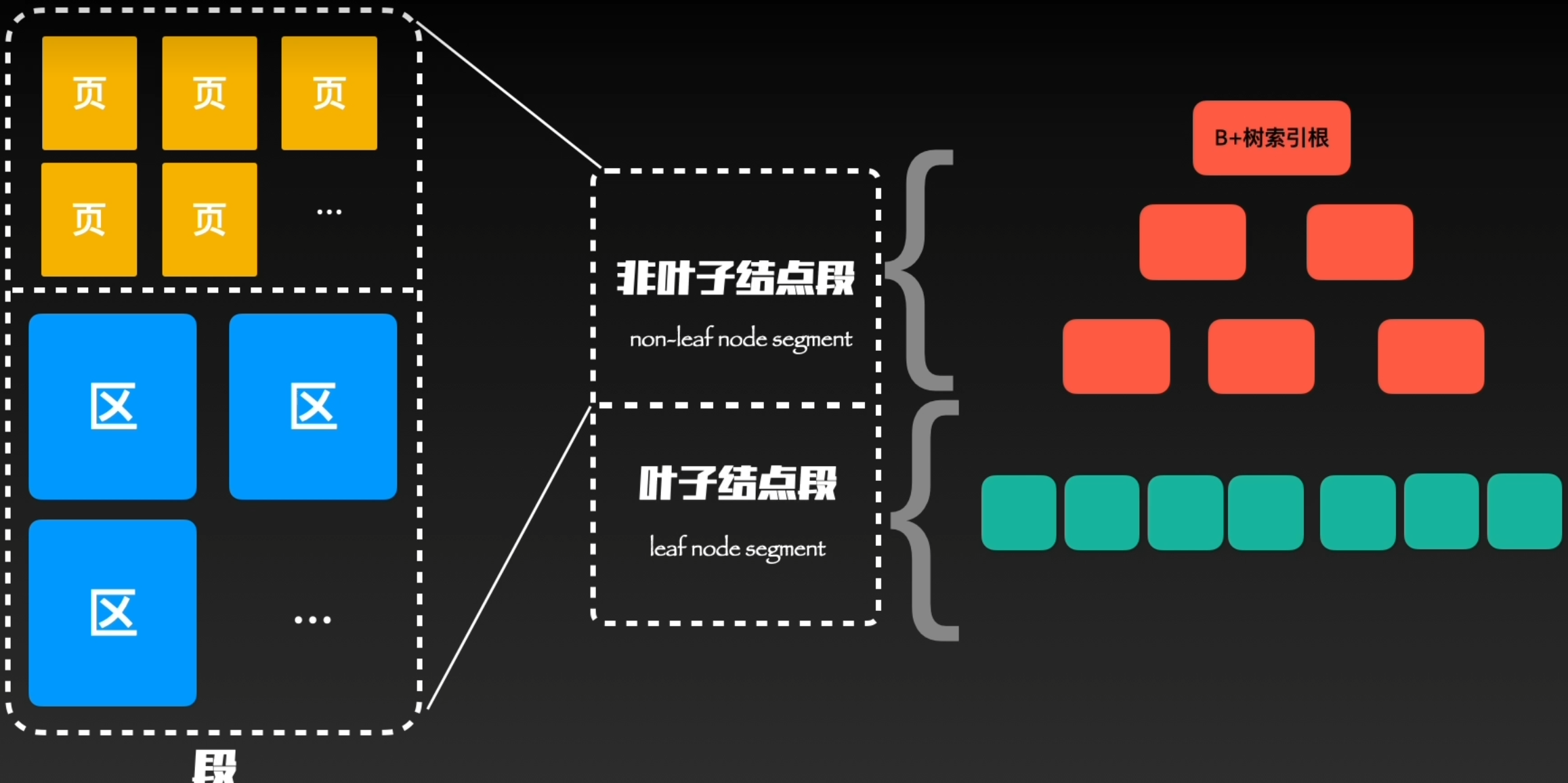 简单理解为”非叶子节点段“存储和管理索引树,叶子节点段管理和存储实际数据