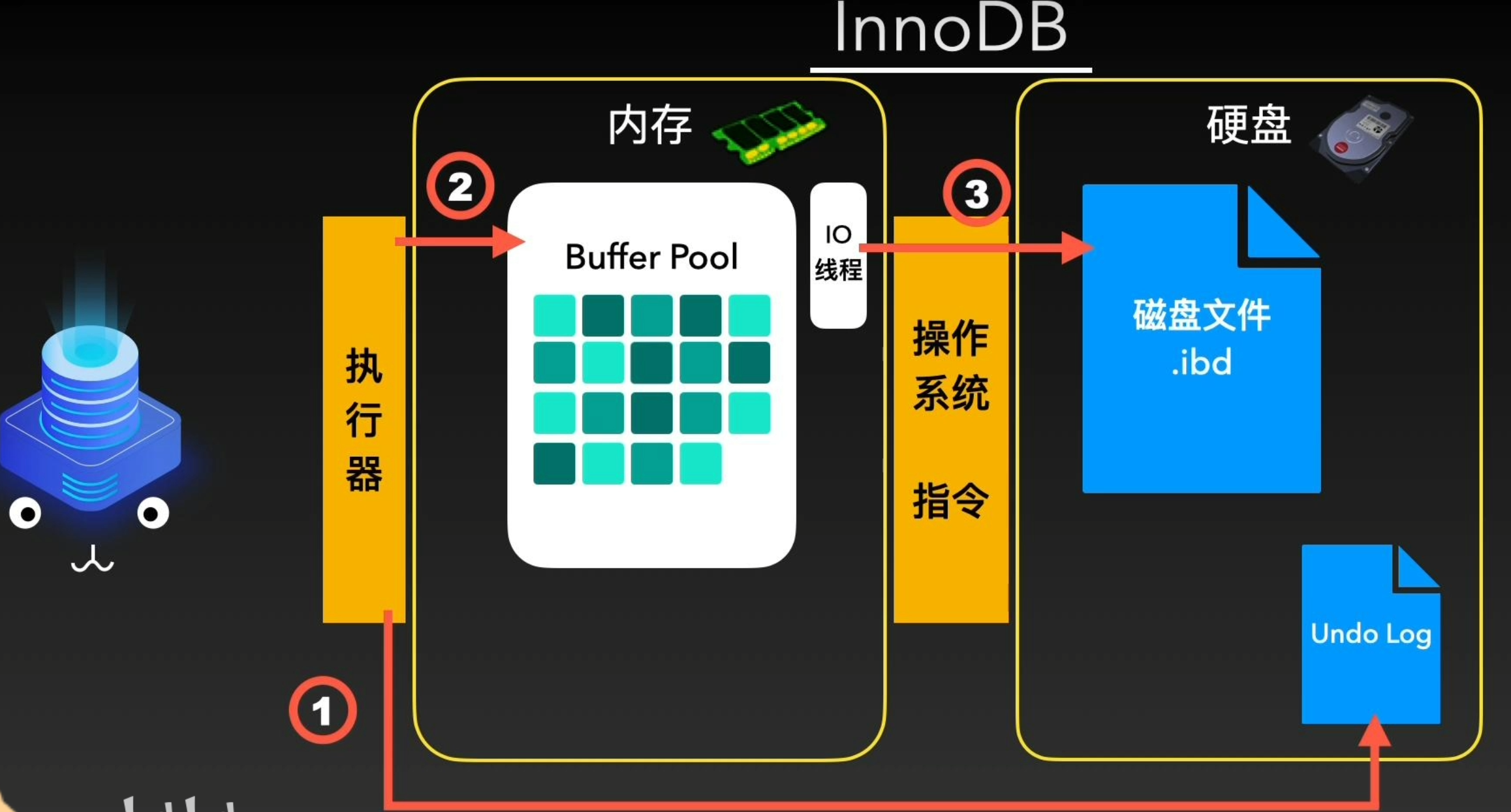 InnoDB会把它需要写入的数据,插入或者更新到Buffer Pool中。为了支持回滚,就需要在此之前,将数据的旧值记录到另一个地方,就是Undo Log文件。将数据写入内存之后,InnoDB就会让IO线程在特定时机将内存中的数据读取并写入磁盘中。