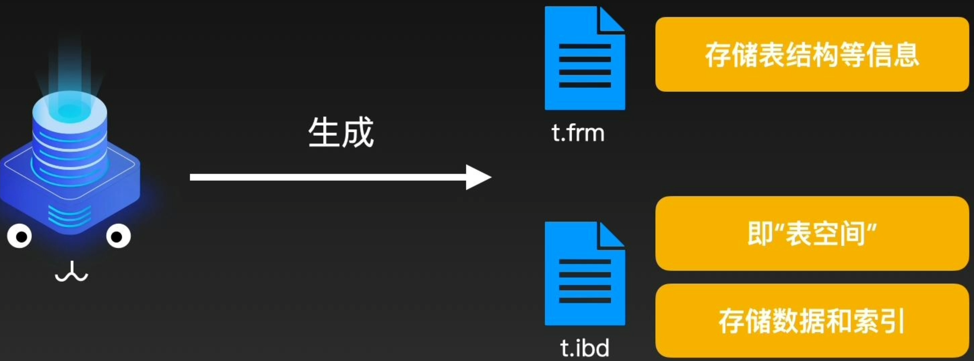当新创建时,会在磁盘data目录下创建对应的两个文件,frm文件存放表结构等信息,ibd文件存储表的数据和索引,(5.7版本之后才会为每个表创建一个ibd文件,称为独立表空间,在此之前所有数据和索引都会被存放在系统表空间中,也被称为共享表空间)