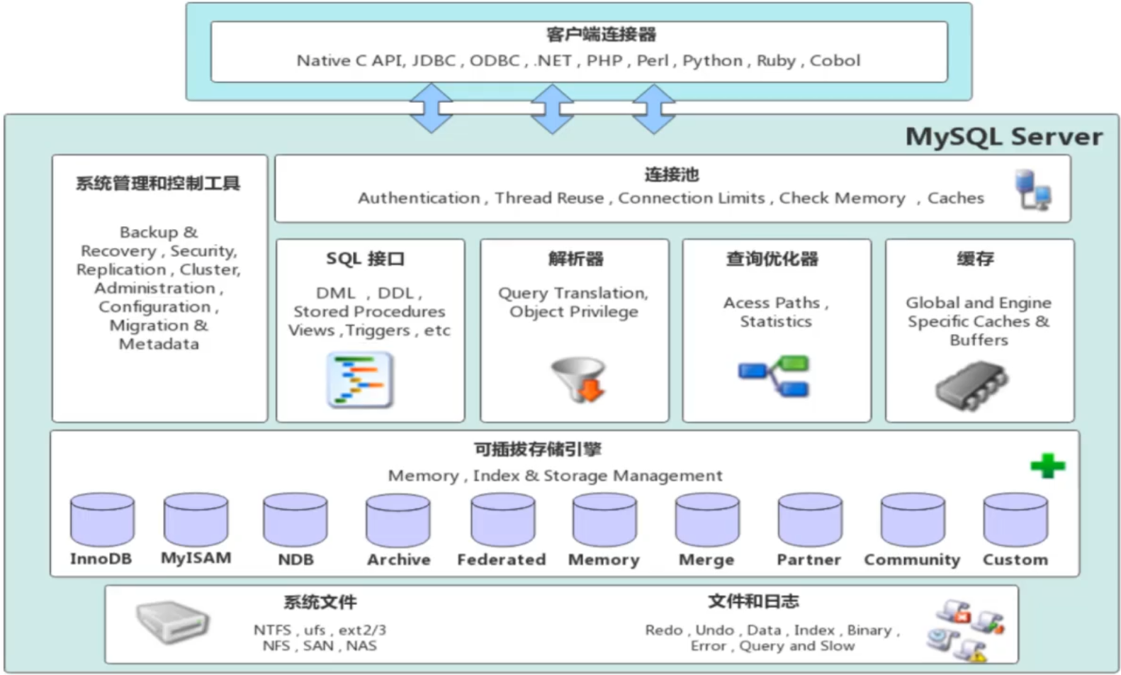 第二层架构主要完成大多数的核心服务功能, 如SQL接口,并完成缓存的查询,SQL的分析和优化,部分内置函数的执行。所有跨存储引擎的功能也在这一层实现,如过程,函数