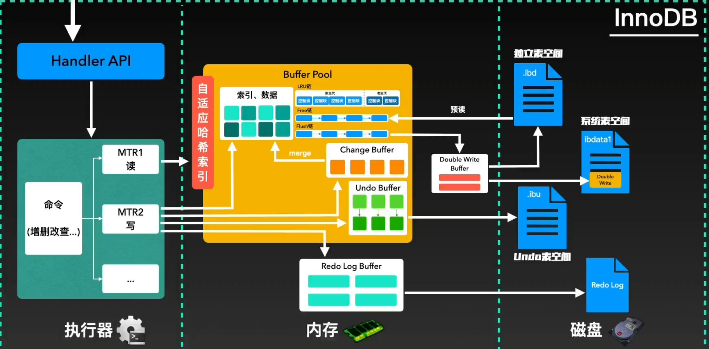 如果是一个读指令,则回去内存中通过”自适应哈希索引(AHI)“进行查找并进行返回。InnoDB会根据”热点页“建立”自适应哈希索引“提升”热点页“的查询速度。如果Buffer Pool中没有找到要查找的数据,则会通过”预读“的方式从磁盘空间中加载到Buffer Pool中,然后返回数据完成读指令。同时Buffer Pool会通过free链表、flush链表、LRU链表这三个链表来管理数据页的写入位置、刷盘位置以及数据页淘汰