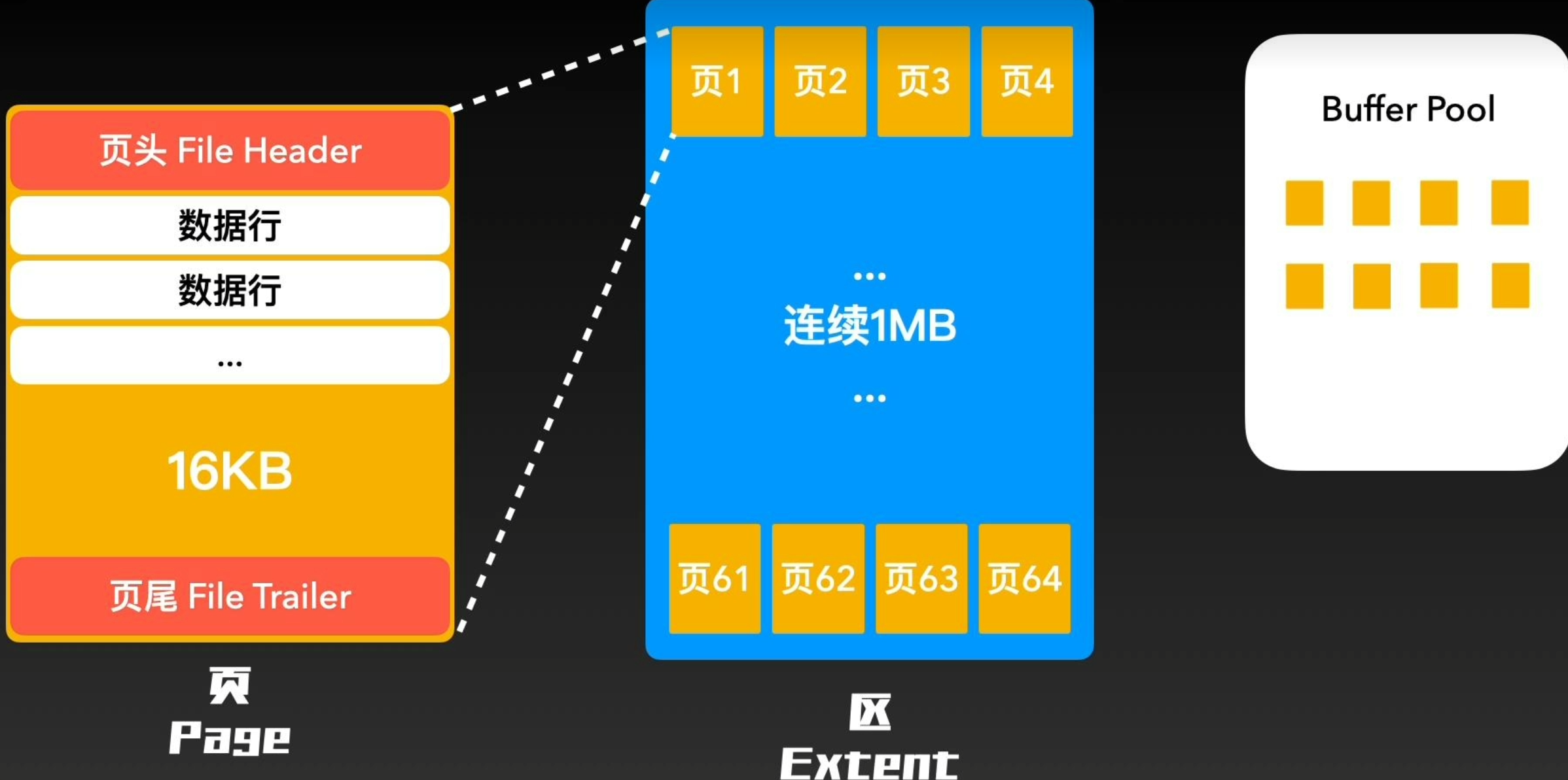 量较大时,跨“页”读取会十分平常,如果多个页物理地址差距过大,(对于机械磁盘)多份数据在磁盘中很可能处在不同磁道,就会发生磁头运动,大大降低性能。所以,使用“区”结构,每个区存放64个地址连续的“页”,这样即使发生跨页读取,大概率也在附近相关地址。同时,如果频繁读取某个区内的页,就可以将整个区内的页全部移入内存,减少后续查询对磁盘的访问次数