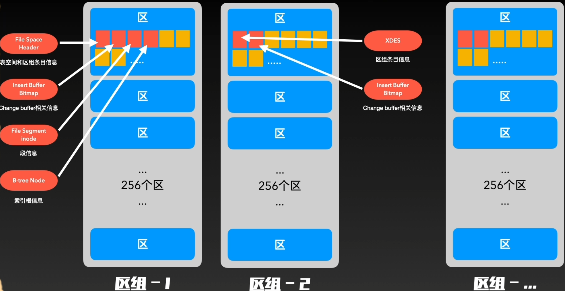 为了有效的管理区,还使用了“组”结构。每一个区组管理固定256个区。第一个区组前四个页较特殊,即6个初始页的前四个,其他区的前两个表均为XDES, Insert Buffer Bitmap。通过区组,可以在物理结构层面高效定位和管理每个区