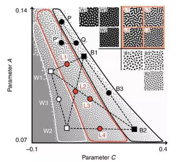 当然,图灵模型也有缺点:图灵机制本身不能解释自然界斑图的尺度缩放。