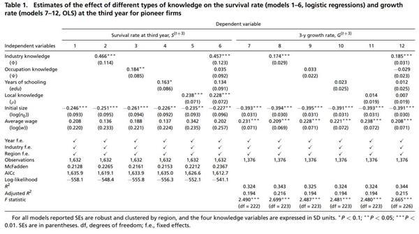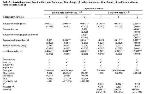 结果也与用最小二乘法得出的结果一样,行业知识对初创公司的发展和存活有着非常重要的作用。行业知识也并非万金油那么行业知识仅仅是对初创公司很重要还是对所有新公司都很有用呢?表2显示的就是初创公司和新公司的对比。