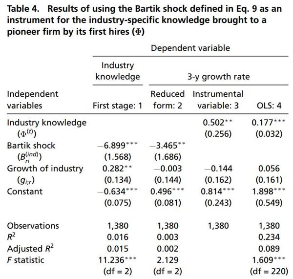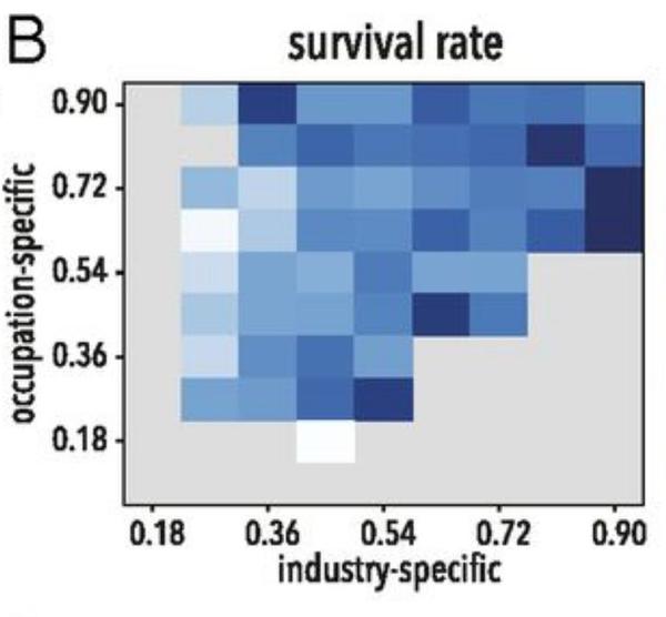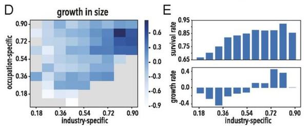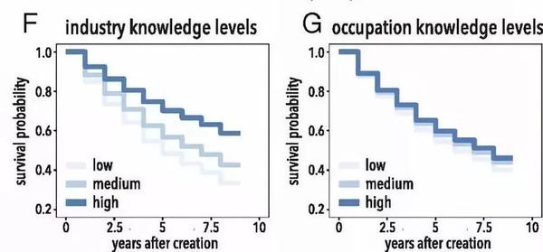 图3F和3G显示的是初创公司幸存率的预测变量。可以看到行业知识比岗位认知有着更为显著的预测作用。实际操作过程中,公司的招人却另有一套逻辑。也许是高效的公司更倾向于招来自相关行业的员工,也许是职位相关的知识不重要,因为公司只是期望招来的人有能力填补岗位技能的空白。公司的选择自然有很多现实的内部考量,所以研究者用当地人力资源供应受到的冲击这样的外部衡量标准来作为招聘的依据。
