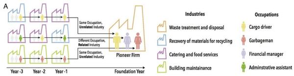 图2A显示就是初创公司的三种人员构成:第一种和第三种的员工来自于同一岗位的不相关行业,第二种员工来自于相关行业的不同岗位。图A显示的是个体工作历史带来的相应知识经验是如何进入初创公司的。每个员工的颜色代表他们的职业,边框的颜色代表行业。比如,黄色的员工有货运司机的经验,进入初创公司也在相同岗位工作,但他来自一个非常不相关的行业。淡蓝色的员工之前在相关行业中担任不同的职位。
