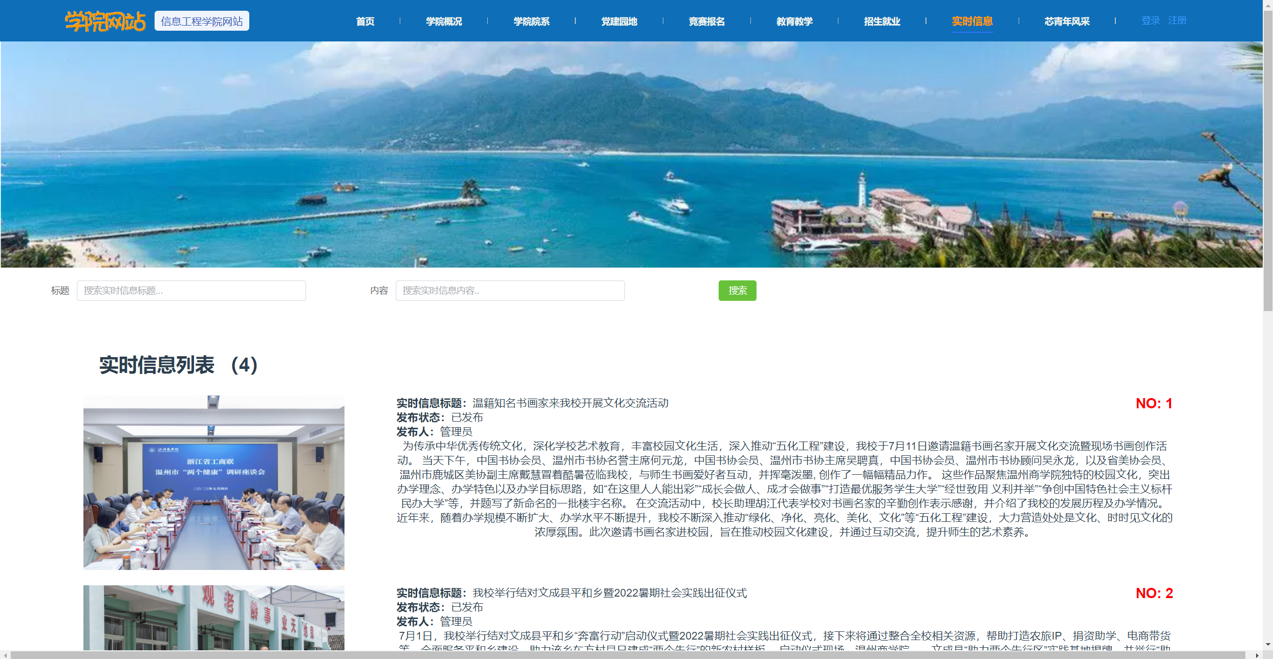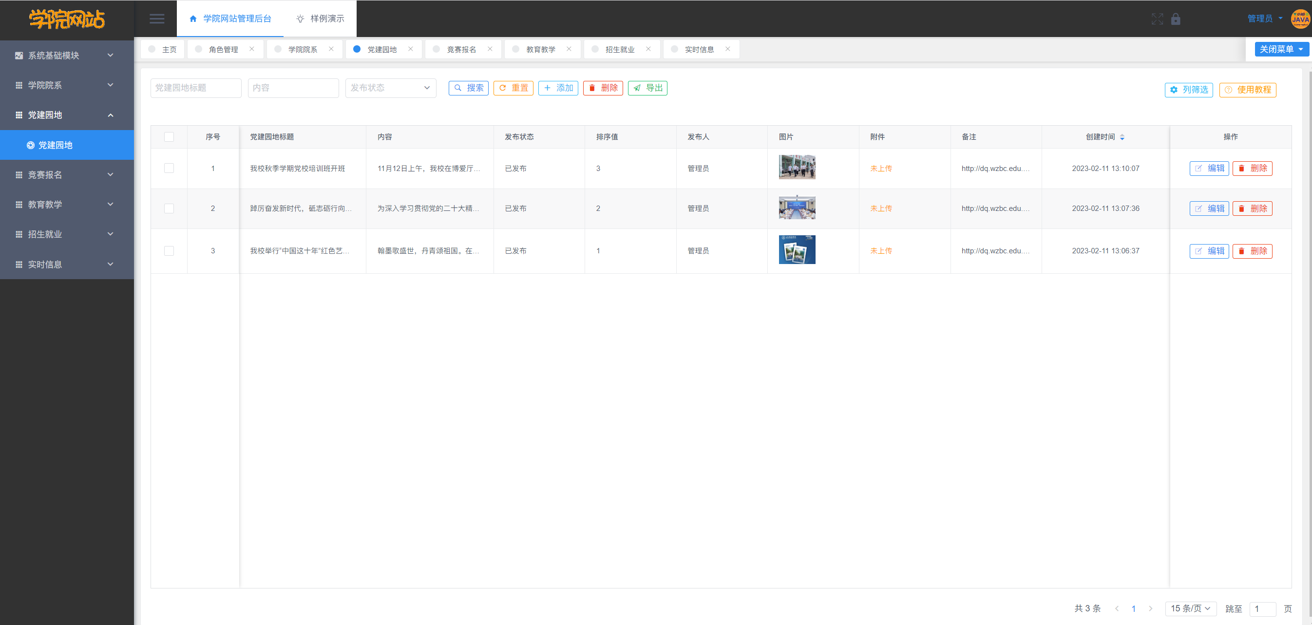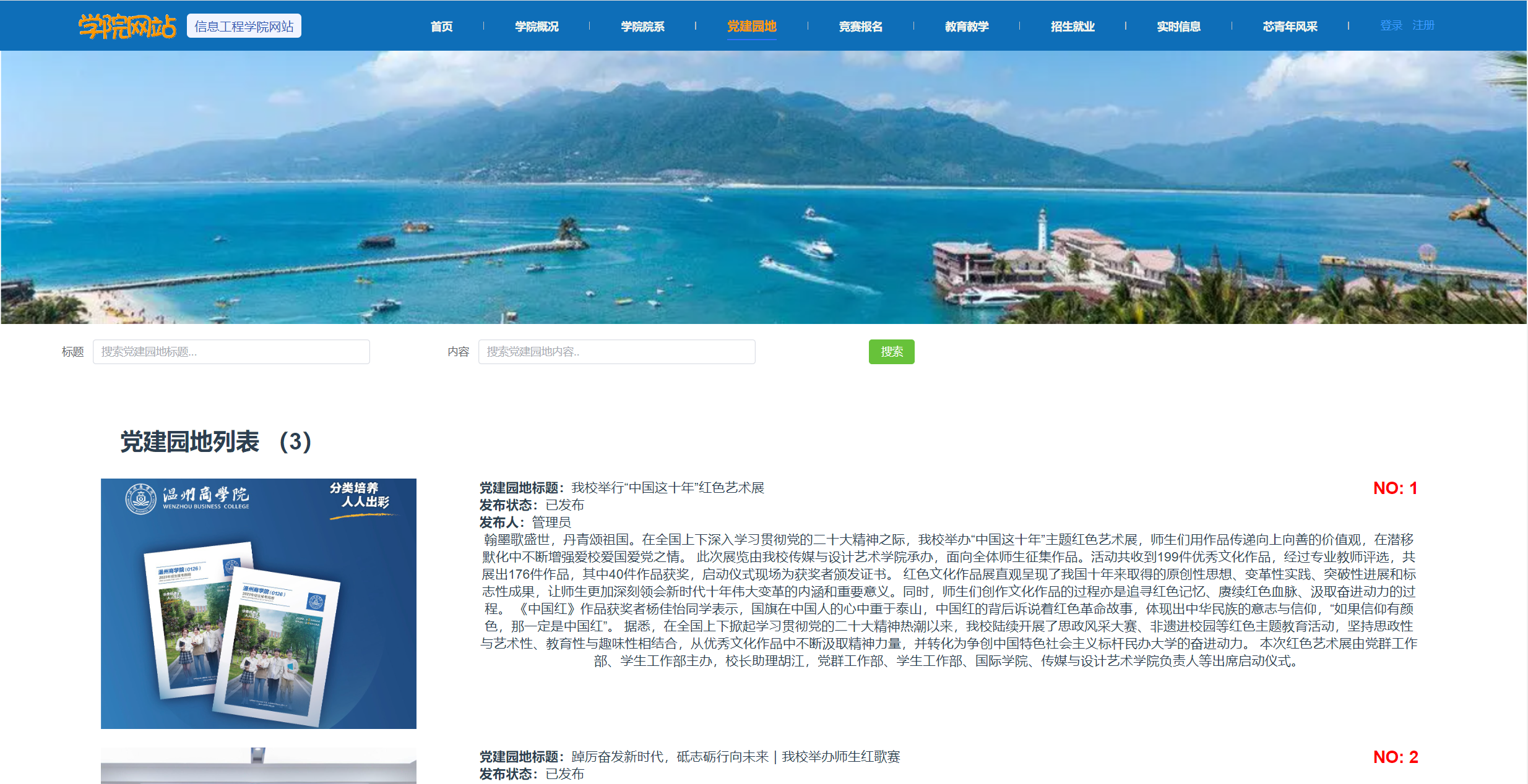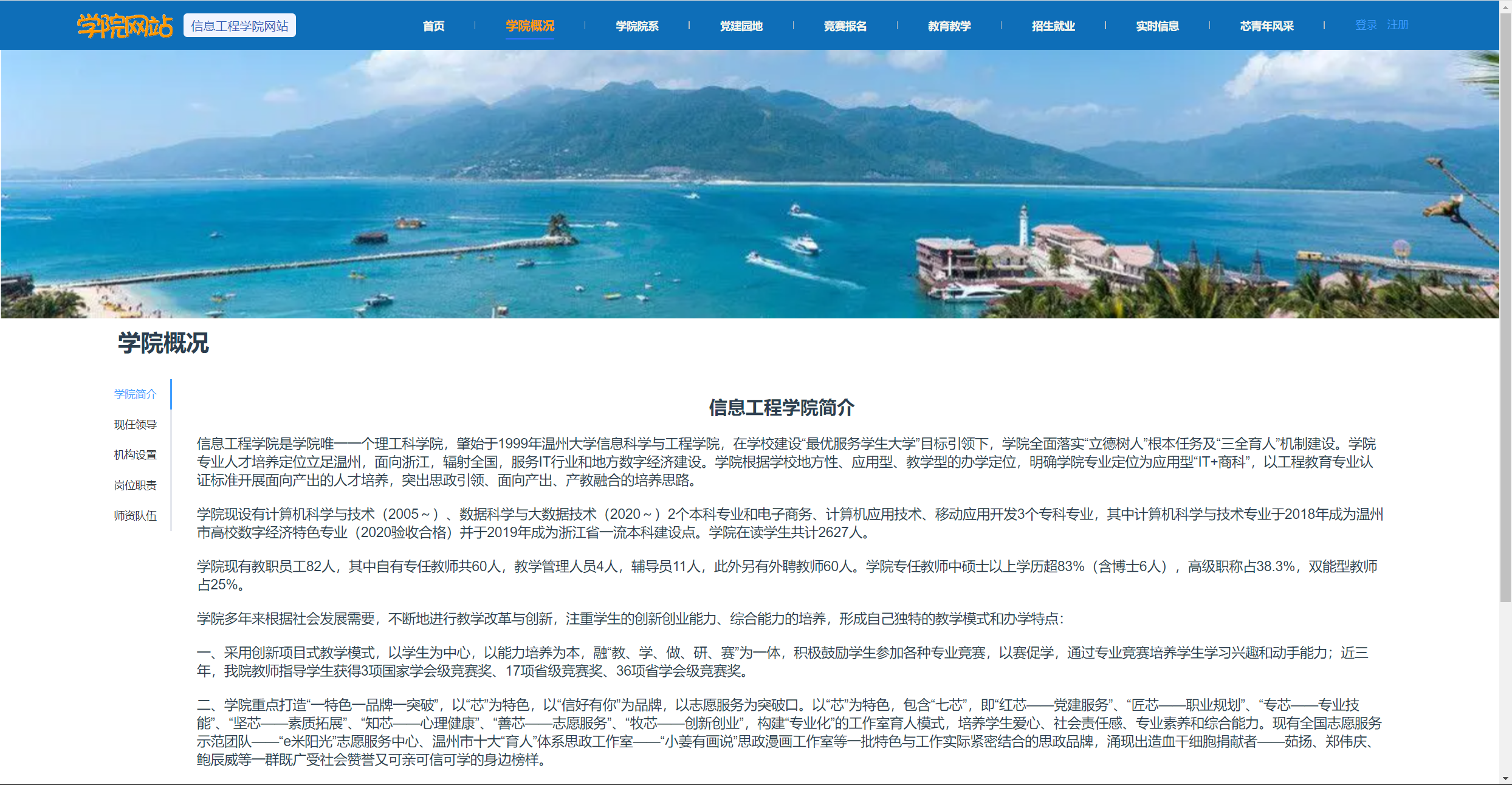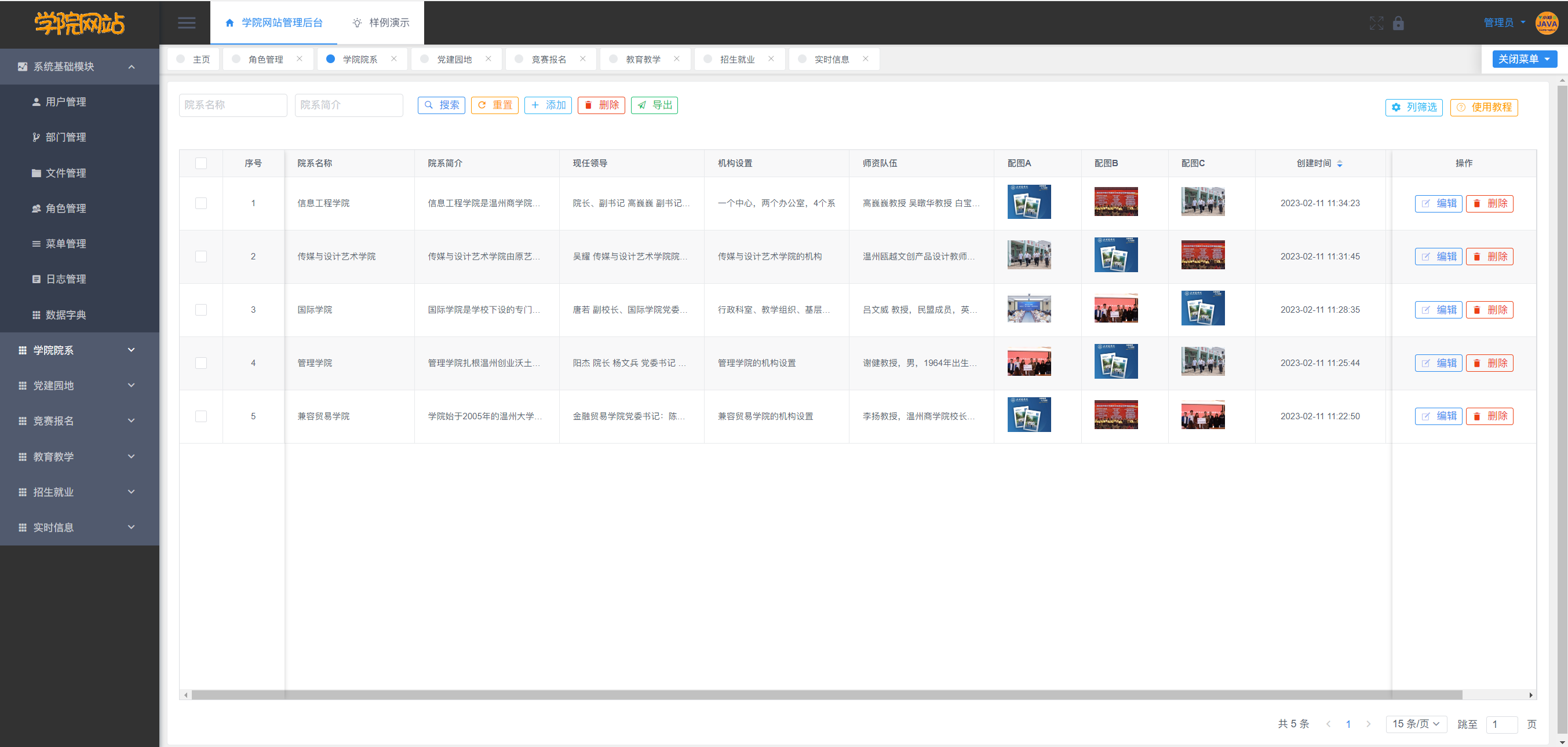 基于Vue2/Vue3+SpringBoot+MySQL的高校学院网站包含学院概况模块、学院院系模块、党建园地模块、竞赛报名模块、教育教学模块、招生就业模块、实时信息模块、新青年风采模块,还包含系统自带的用户管理、部门管理、角色管理、菜单管理、日志管理、数据字典管理、文件管理、图表展示等基础模块,高校学院网站基于角色的访问控制,给高校管理员、学生使用,可将权限精确到按钮级别,您可以自定义角色并分配权限,系统适合设计精确的权限约束需求。