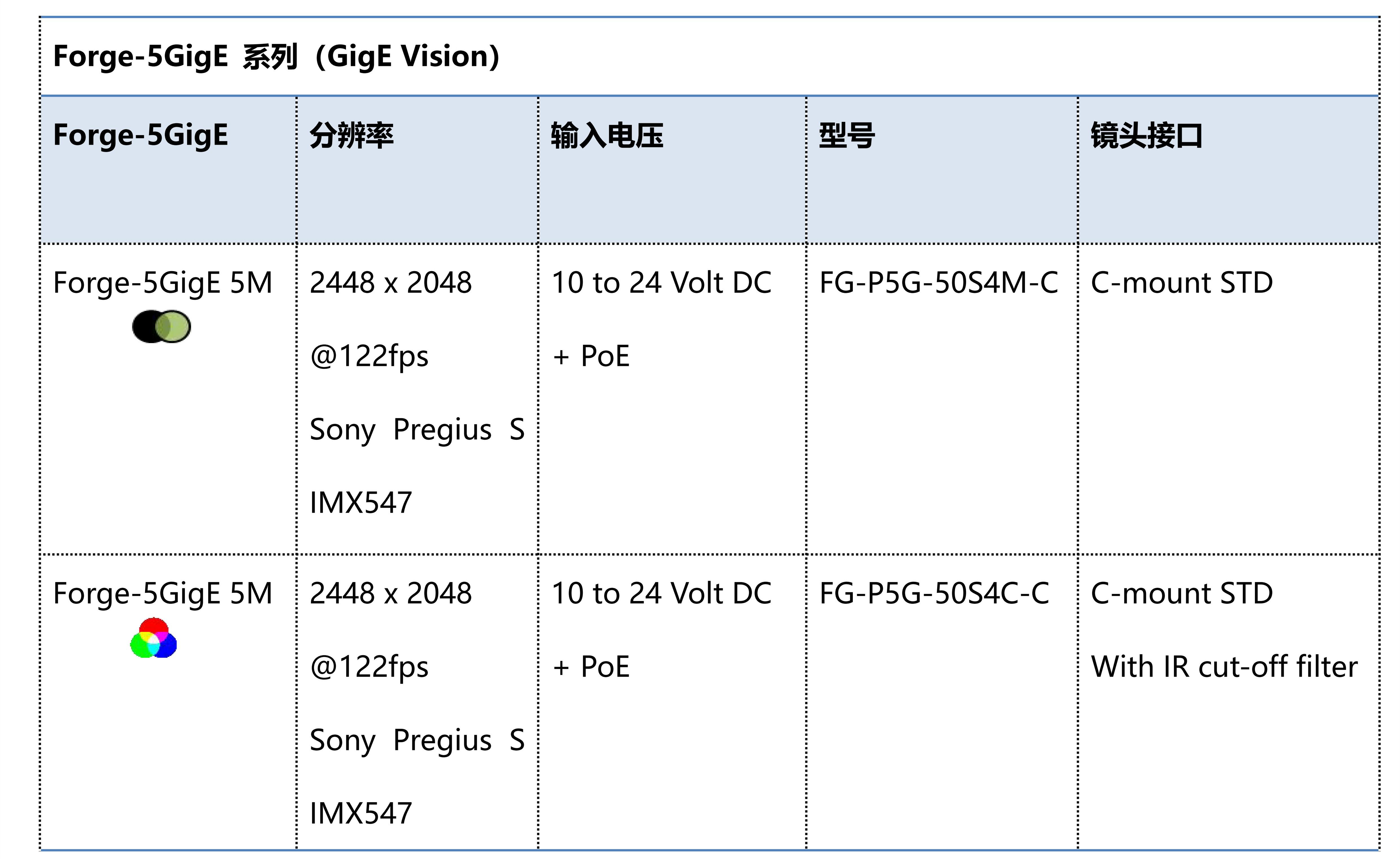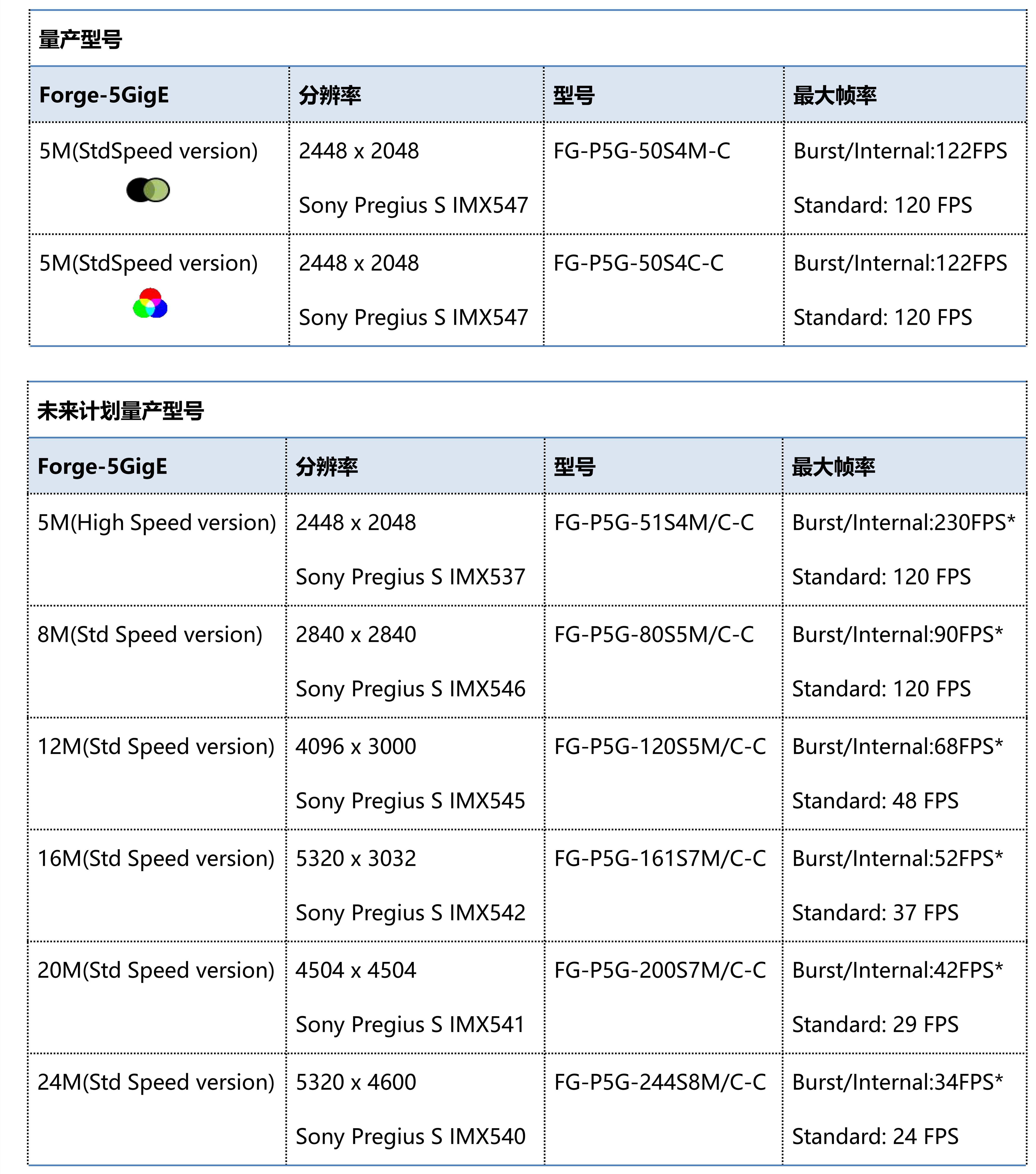 Forge-5G 5M黑白/彩色相机现已开始量产,可订购。