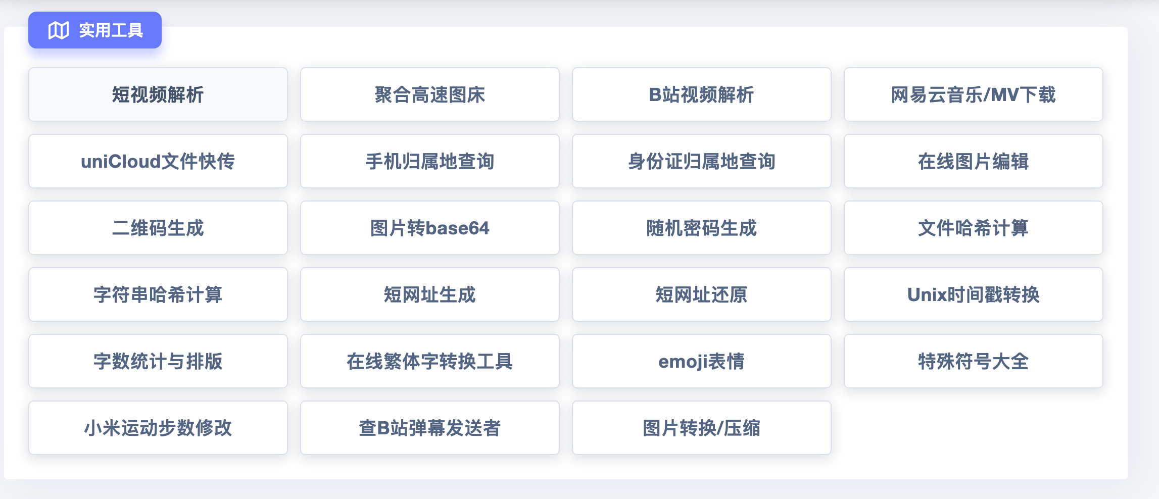 1:短视频解析、B站视频下载、聚合高速图床、网易云音乐下载、文本/代码在线比对、Cron在线生成、正则表达式大全、正则在线测试、正则可视化、Python/Java/Js等代码在线运行、Github下载加速、Linux命令查询 等70多个在线实用工具。