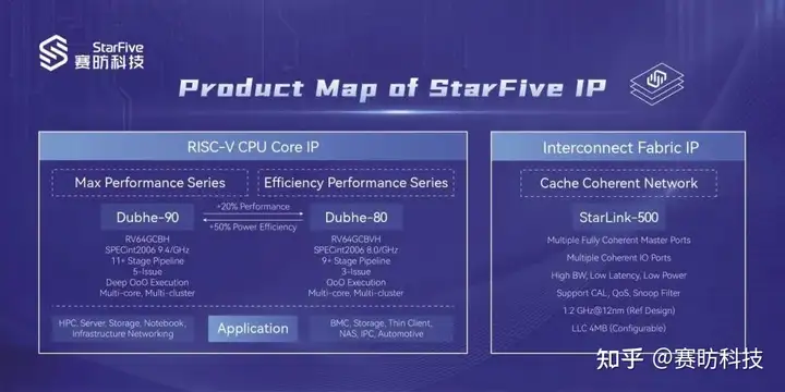 2022年,赛昉科技向客户交付了当时业界性能最高RISC-V CPU Core IP——昉·天枢(Dubhe)。一年后,赛昉科技再次发布性能更高的CPU Core IP——Dubhe-90,性能比肩ARM Cortex-A76,SPECint2006 9.4/GHz,继续保持国产可交付性能最高的商业级RISC-V CPU IP产品的领先位置。Dubhe-90的客户主要来自于PC、高性能网络通讯、机器学习、数据中心等高端应用领域。