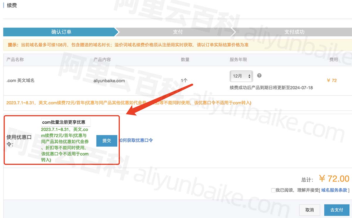 先复制上方的优惠口令,根据域名后缀复制所需优惠口令,正常注册或续费域名,在域名结算页面,找到优惠口令输入框,粘贴优惠口令,然后点提交,即可享受优惠口令价,如下图:
