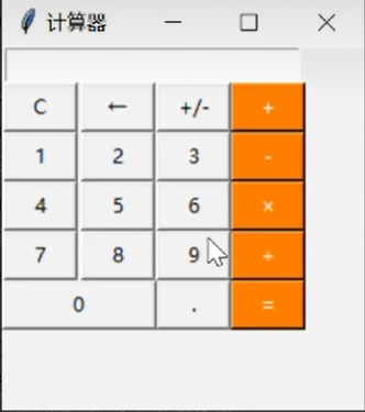 btnequ = tkinter.Button(root, text='=', bg='orange', font=('宋体', 20), fg=('#4F4F4F'), bd=0.5, command=