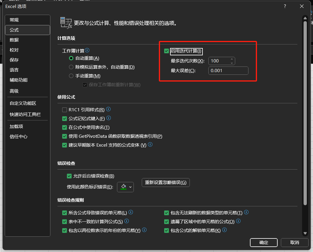 在 Excel 中,当出现循环引用时,反复循环递归的计算,即为迭代计算。迭代次数及迭代误差,可以在 Excel 的设置中配置。默认为 100 次。