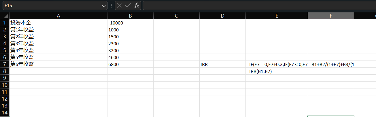 可以看到,小编一开始给 E7 定了一个初始值 0.3 (30%)。然后判断 F7 (NPV)的值,净值会随着 IRR 变小,逐渐变大,而 - 0.000001,则是每一次计算,对于 IRR 的调整。假定当 NPV 大于 0 时,IRR 计算停止,只要每一次对 IRR 的调整足够小,就可以近似的认为当 NPV 大于 0 的那一次结果趋近于 0。