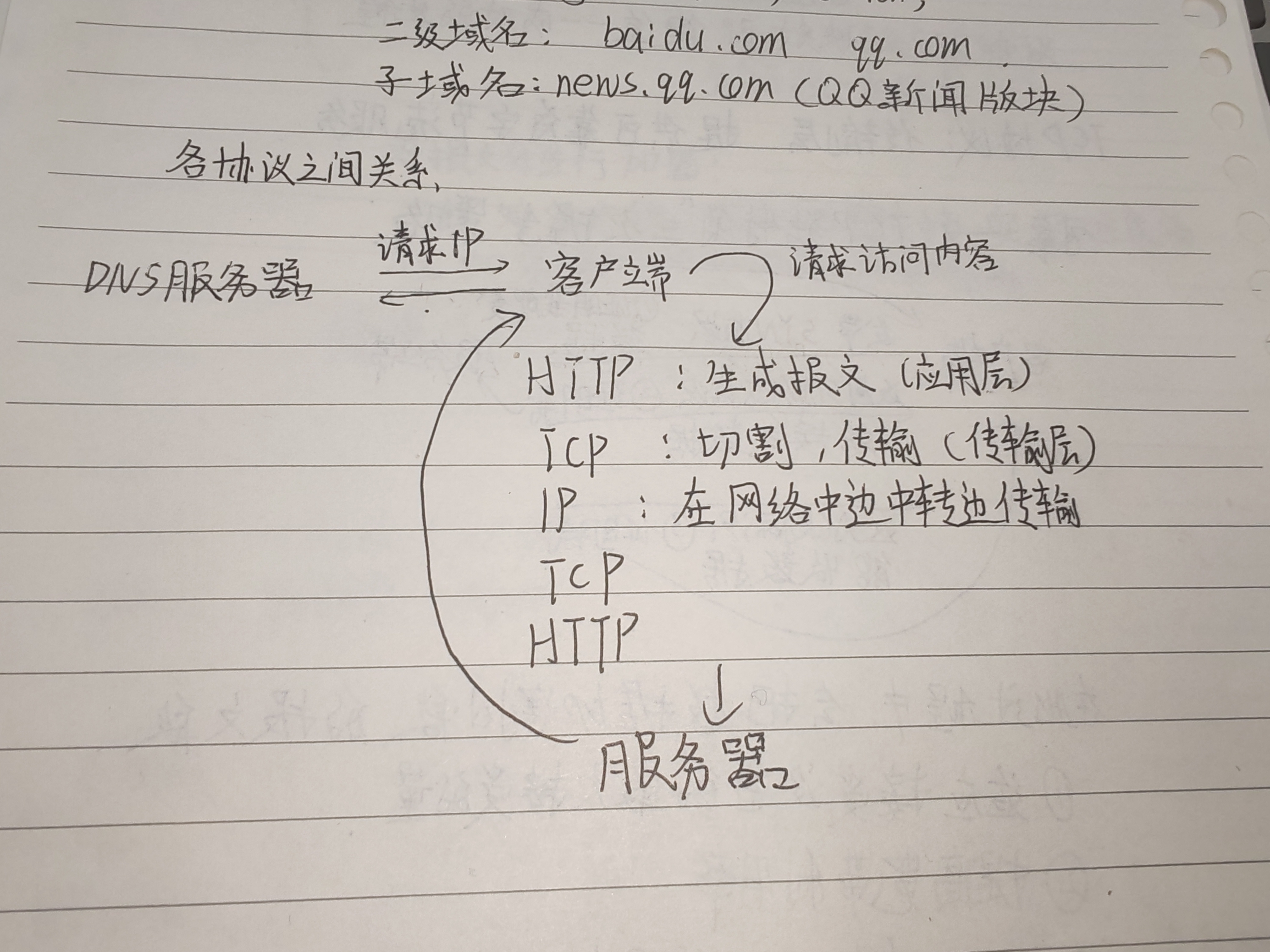 经过HTTP——TCP——IP——网线——IP——TCP——HTTP的过程