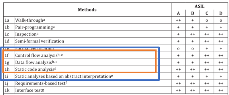 ISO 26262标准对于ASIL C/D级软件强烈建议的7类验证手段中,“1f控制流分析”、“1g数据流分析”、 “1h源代码静态分析”三类可以通过静态分析工具结合合适的编码规范(如:MISRA C:2012、MISRA C++:2008、AUTOSAR CPP14等)自动化完成。