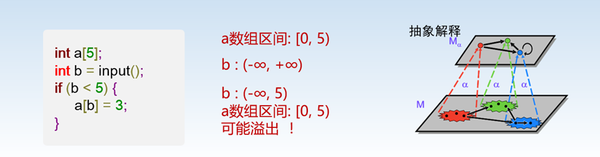 采用抽象域对程序变量的取值进行近似,进而通过迭代求得程序行为不动点的一项技术。数据流分析是抽象解释的一个特例。抽象解释擅长数值类型的缺陷检测,如除零错、数值溢出等。