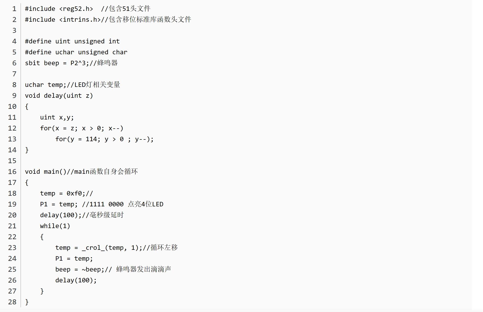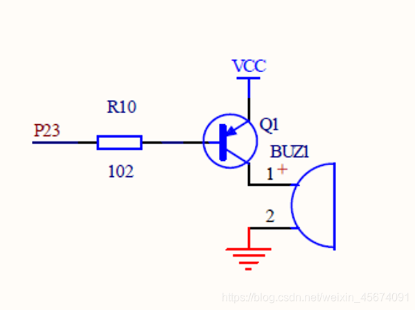 当P23口输出高电平(5v)时,vcc即电源也是5v,此时三极管没有导通,所以蜂鸣器也没有反应,当输出低电平时,发射极电压远大于基极,电流从发射极流入集电极,蜂鸣器震动。