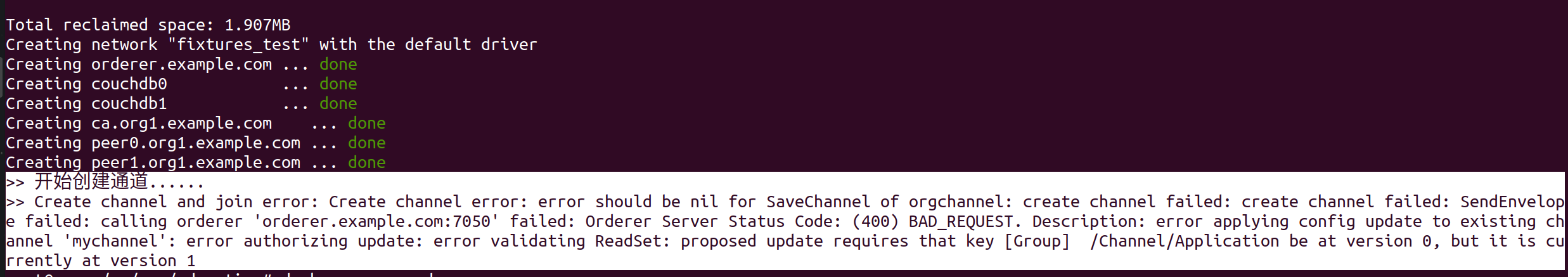 >> Create channel and join error: Create channel error: error should be nil for SaveChannel of orgchannel: create channel failed: create channel failed: SendEnvelope failed: calling orderer 'orderer.example.com:7050' failed: Orderer Server Status Code: (400) BAD_REQUEST. Description: error applying config update to existing channel 'mychannel': error authorizing update: error validating ReadSet: proposed update requires that key [Group] /Channel/Application be at version 0, but it is currently at version 1
