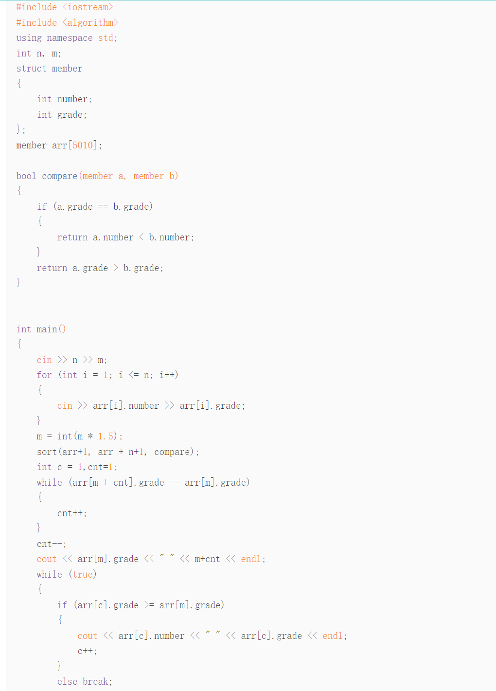 思路:用结构体储存每位选手的报名号和笔试成绩,然后利用sort函数的自定义函数从大到小排序,求出第m*150%位选手后面有多少个和它相同的数,最后输出