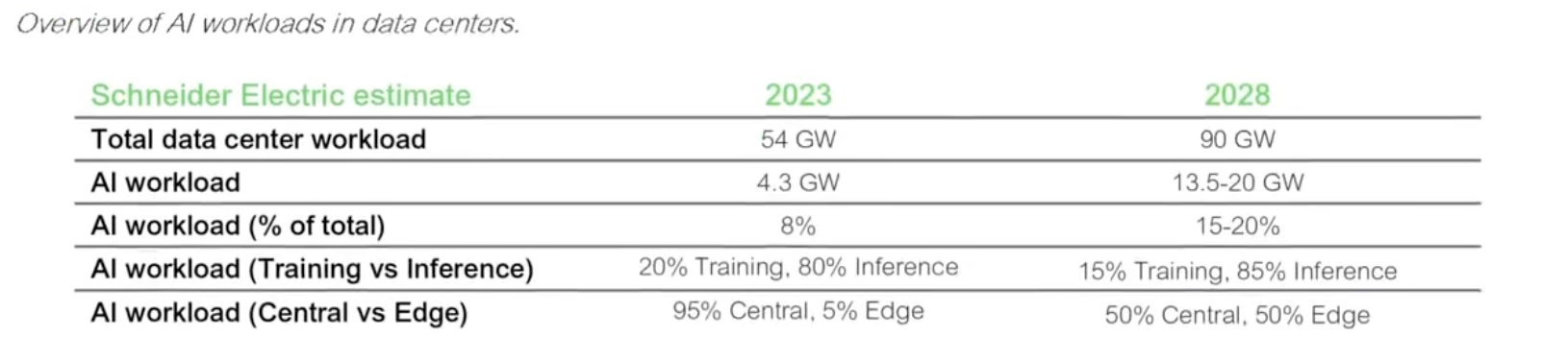 近日,根据德国施耐德电气最新发布报告显示——2023年AI负载功耗需求为4。3G瓦——大约相当于2021年丹麦的全年平均功耗。据施耐德电气称,到 2023 年,所有数据中心的总功耗预计将达到 54 GW。在这些人工智能工作负载中,训练和推理之间的分配特点是 20% 的功耗用于训练目的,80% 分配给推理任务。这意味着人工智能工作负载将占今年数据中心总功耗的约8%。