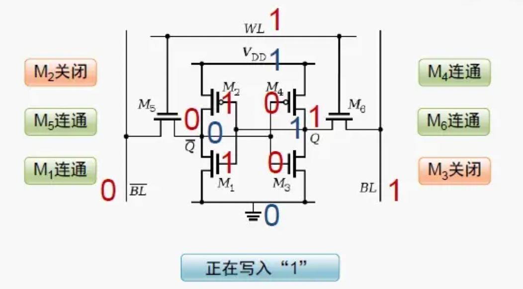 SRAM最经典的单元为6T结构。存储器构造的核心是存储阵列,它是影响整个SRAM的面积开销和读写性能的主要方面。在存储阵列中,基本的存储单元在水平方向上采取共享字线(WL)的方式;在垂直方向采取共享位线(BL)的方式。晶体管M1和M4组成左侧反相器,M2和M3组成右侧反相器,两个反相器通过反馈作用形成背靠背反相器,从而保持数据。晶体管M5和M6是存取晶体管,存取晶体管的栅端共用一条WL信号,存储节点分别通过这两个晶体管与BL和BLB进行连接。只有当这两个晶体管被开启时,相应的读写操作才能被执行。这种设置是典型的CMOS技术,相当于一个“触发器”电路,只要系统正常供电,就能在稳定状态下存储信息“0”或“1”。