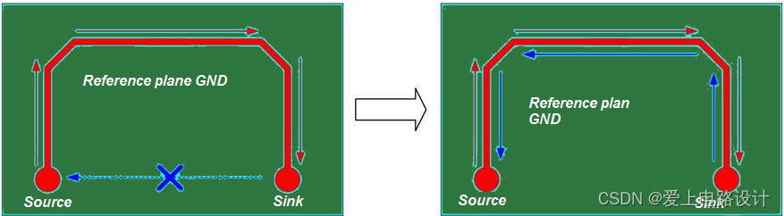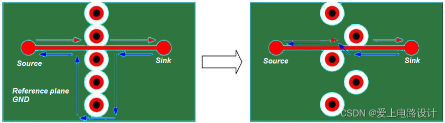 返回路径在信号的源和接收处。在下图中,左侧的设计被认为是不好的设计。由于源侧只有一个接地过孔,因此返回电流无法预期返回参考接地平面。返回路径是存在于顶层的接地连接。