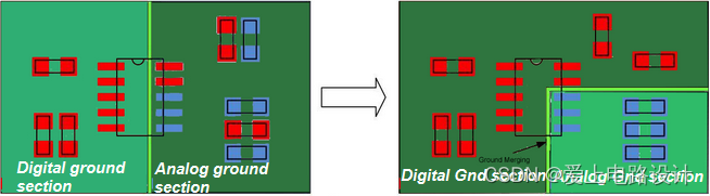 数字地和模拟地的合并应靠近集成电路放置。在具有分离平面的混合信号设计中,数字信号不应该通过模拟接地平面布线,模拟信号不应该通过数字地平面布线。