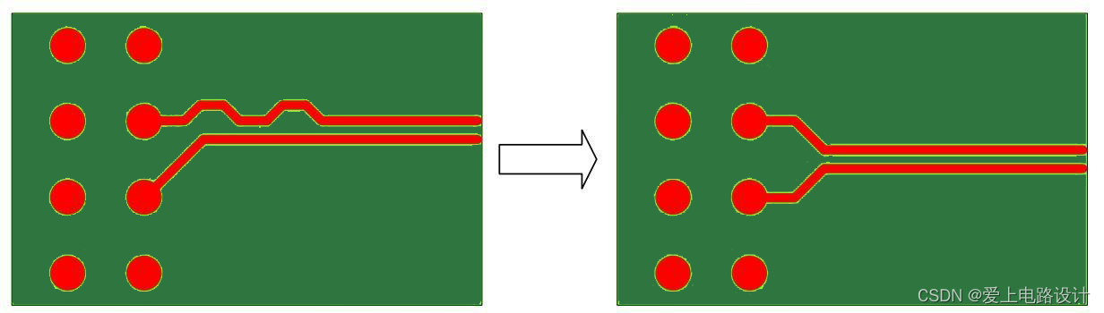 如下图所示,首选差分对信号的非对称分流,尽可能避免蛇形走线。