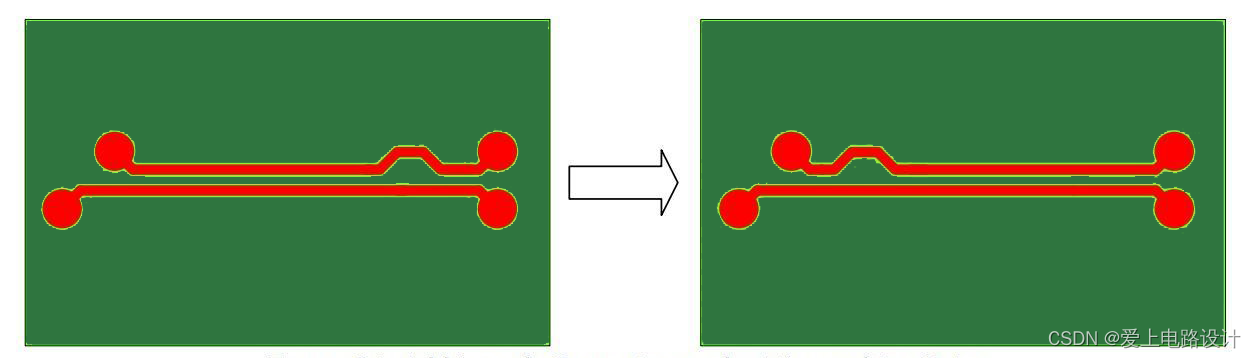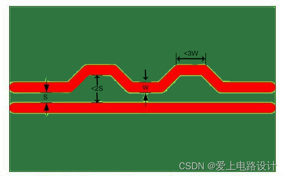 差分对信号要求正负信号走线之间的延迟偏差非常小。因此,使用蛇形来补偿任何长度差异,必须要仔细设计蛇形走线的几何形状,如下图,减少阻抗不连续性。