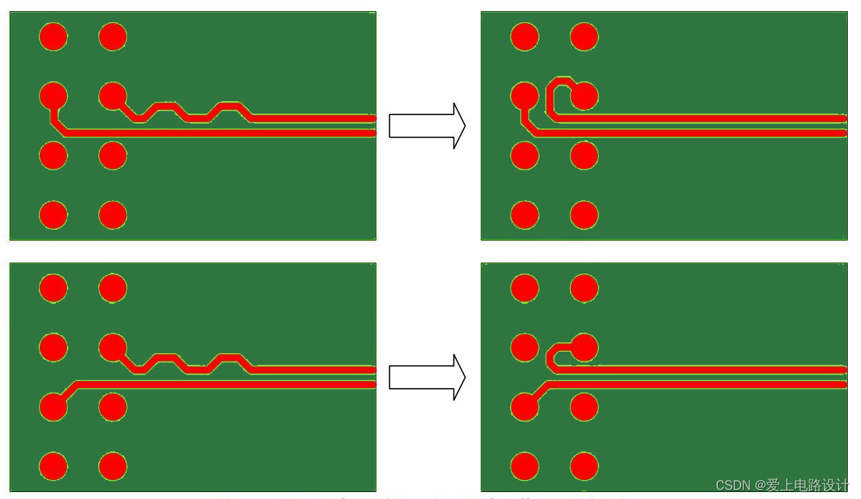 如果焊盘之间有足够的空间,则可以为较短的走线包含小环而不是蛇形走线,过孔优于蛇形走线。