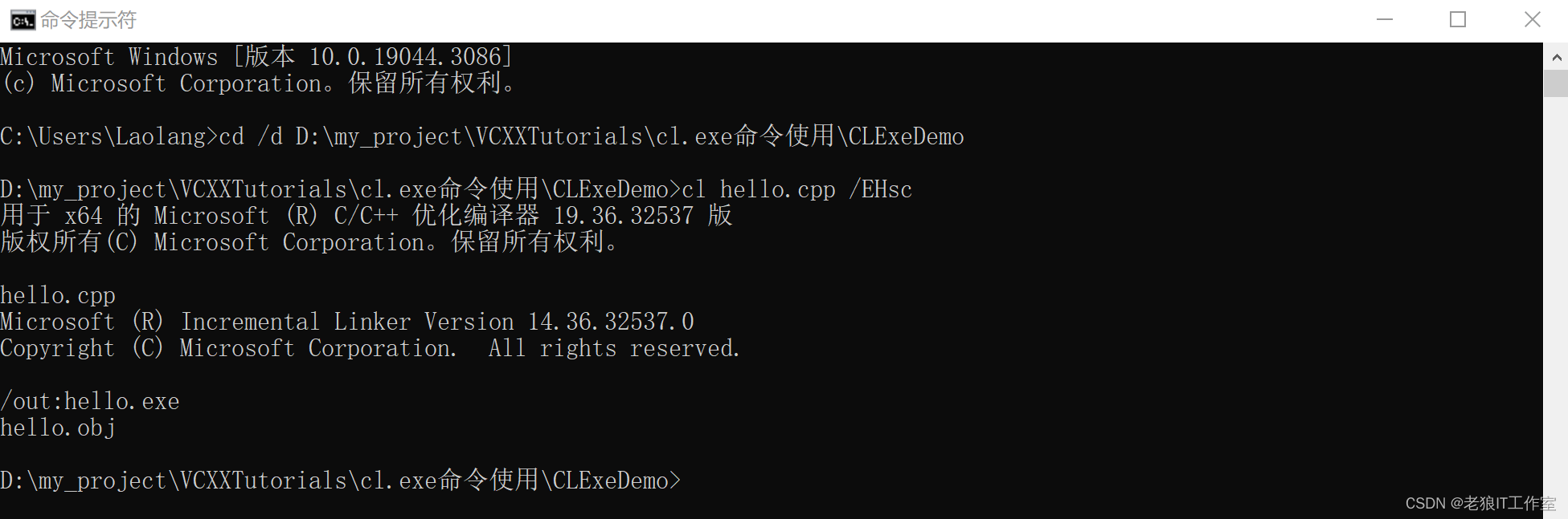 修改完,并保存确认生效,然后启动一个新的命令行窗口,再次运行“cl hello.cpp /EHsc”命令,这时候编译成功啦。