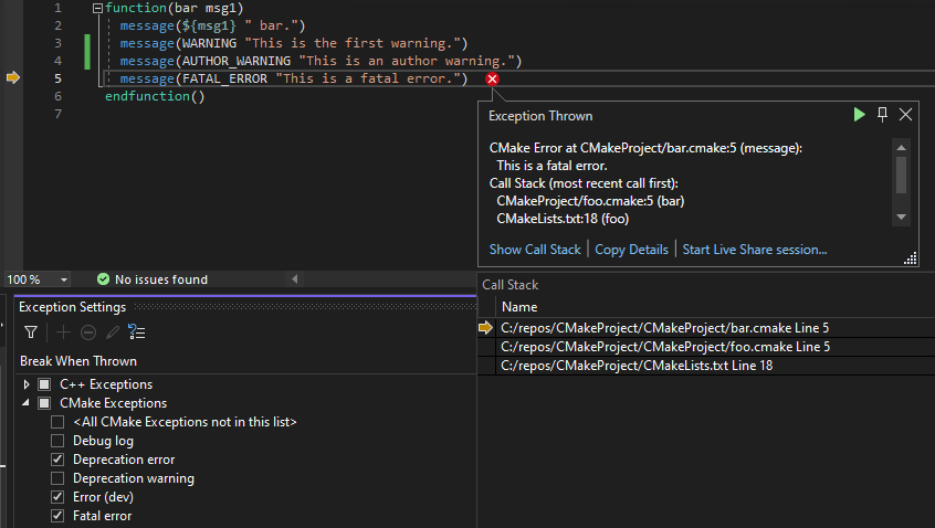 与 Visual Studio 一样,使用新的CMake 调试器来调试 CMake 脚本,就像调试任何其他程序一样。您可以设置断点、查看当前执行点的 CMake 变量的值等等。