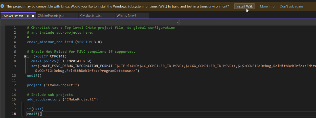 使用“Install WSL for Me”从 Visual Studio 自动安装适用于 Linux 的 Windows 子系统。