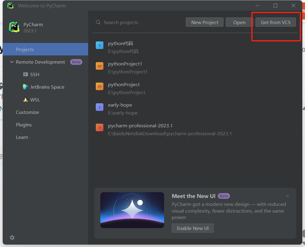 然后将代码上传到Gitee保存,退出到python首页,点击“get from vcs”