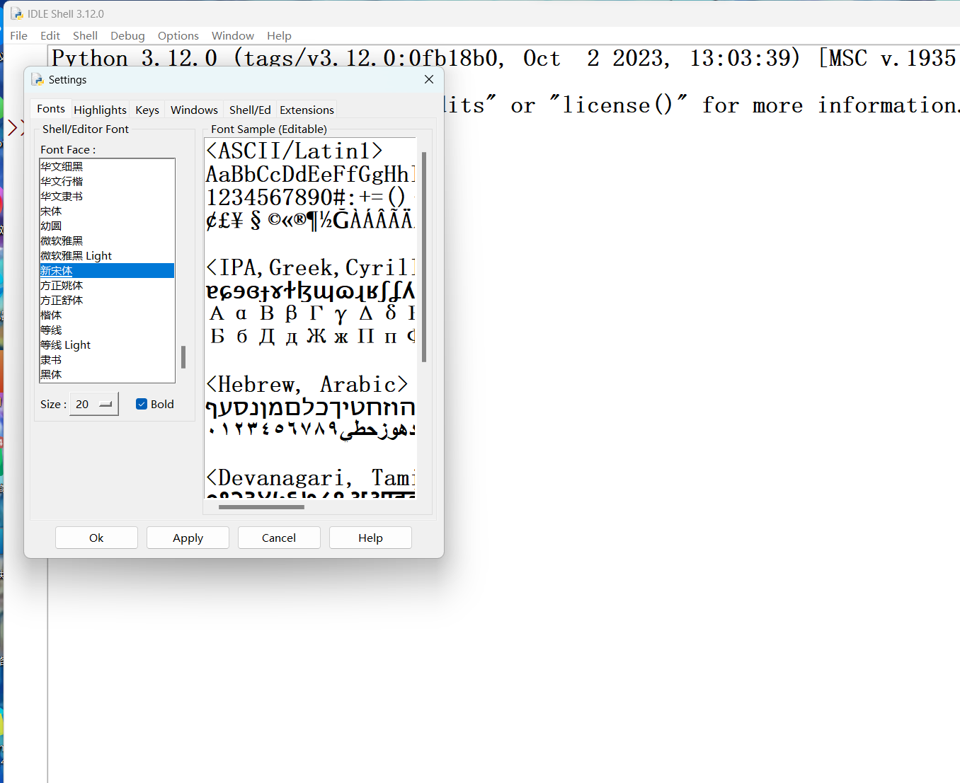 (3)熟悉各个功能栏,熟悉各种设置与功能,可以打开“options——configure IDLE”改变字体和文字大小,如图: