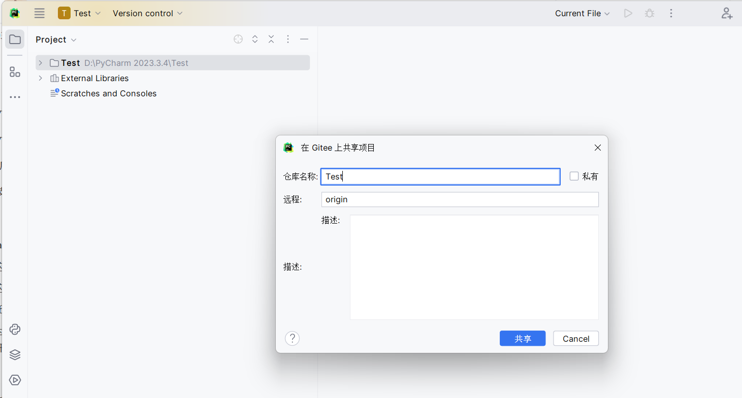 6)将本地项目同步至Gitee。首先在本地创建一个项目,如下新建了一个名为test的项目; 然后点击VCS,在Gitee上共享项目,新建仓库,设置仓库名称,即可新建同步到Gitee的仓库。